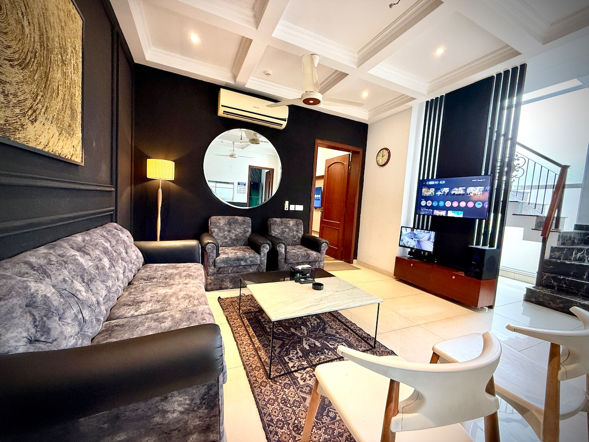 Disfruta de una experiencia inolvidable en un alojamiento céntrico. • Wifi ultrarrápido con LED de 55 pulgadas para una experiencia de Netflix eterna. • Sistema central de refrigeración y calefacción. • Cocina totalmente equipada con té de cortesía a la llegada. • Estacionamiento cerrado y vigilado con CCTV 24/7. • Terraza de hierba con sillas acogedoras para sesiones tranquilas. • A solo 5 minutos a pie del mercado DHA Phase 5 y de la tienda Imtiaz Super Store. • A solo 5 minutos en auto de Lahore Ring Road. • A solo 10 minutos en auto del aeropuerto de Lahore.