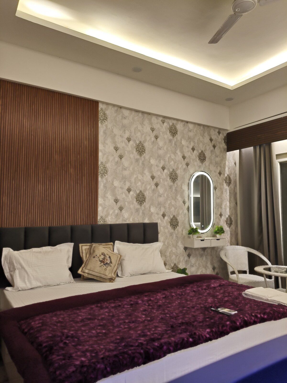Acerca de esta propiedad: ✨ Dormitorio principal: cuenta con una cama tamaño super king con un colchón Sleepwell de lujo (valorado en ₹1.3L) para una comodidad inigualable, un sofá de tres plazas, aire acondicionado split, ventilador de techo inteligente, televisor Android QLED de 65 pulgadas con barra de sonido JBL, baño adjunto e iluminación cuidadosamente diseñada que crea un ambiente acogedor. 🌿 Amplio jardín: disfruta de un jardín privado de 330 pies cuadrados con una elegante área de estar, perfecta para noches a la luz de la luna con elegantes luces de pared cálidas para un ambiente sereno.