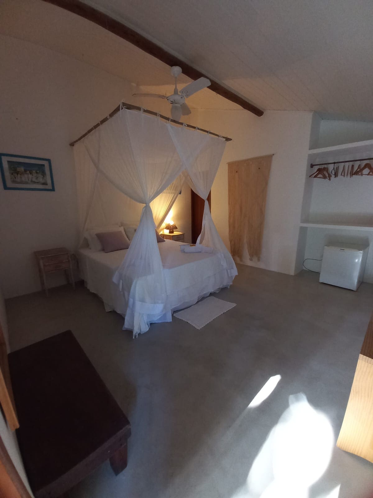 Acogedor chalet a menos de 5 minutos a pie de la calle más encantadora de Brasil hasta la Rua do Mucugê, playas y comodidades. Estamos preparados para ofrecerte unas vacaciones únicas disfrutando de todos los momentos del histórico Arraial d'Ajuda. Todos los chalets completos con cama doble, camas individuales, aire acondicionado, baño privado, balcón con hamaca y cocina completa (nevera, estufa y utensilios). Ambiente tranquilo con comodidad y calidad.