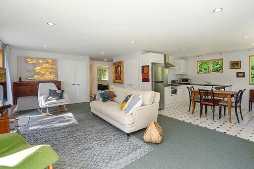 Esta casa de campo de tres dormitorios cuenta con suelos de hormigón pulido en la cocina de planta abierta, sala de estar y comedor. Las habitaciones están completamente alfombradas y cuentan con vistas a las montañas y al mar. Dos de los dormitorios tienen acceso a la terraza. El baño, totalmente alicatado, cuenta con una bañera con patas, ducha, inodoro y dos tocadores. La cocina totalmente equipada incluye lavavajillas y hay una lavandería exterior con lavadora y secadora. La propiedad está rodeada por el histórico Maori Pa.