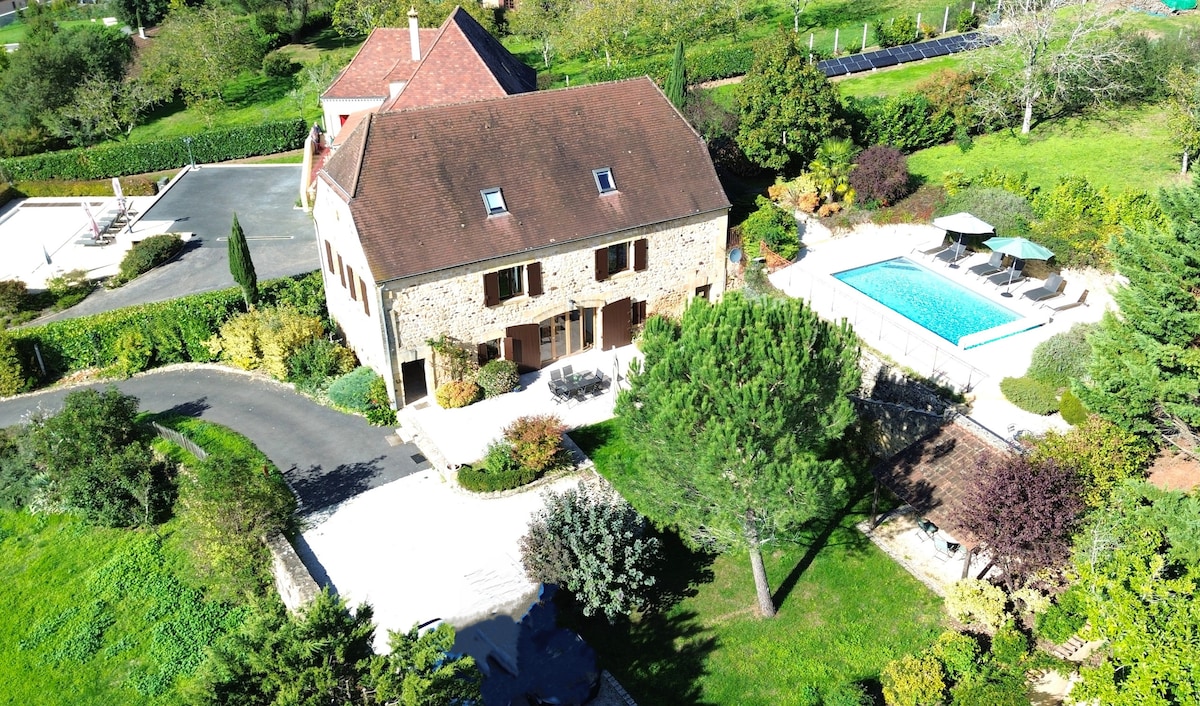Te damos la bienvenida a nuestra hermosa casa de campo enclavada en colinas onduladas y boscosas. Disfruta de una vista excepcional de 180° de la Dordoña mientras nadas en nuestra piscina infinita (abierta de mayo a octubre solamente) o en el jacuzzi (disponible todo el año). Nuestra propiedad se encuentra en 4 acres de tranquila campiña en la parte superior de los verdes valles de Dordoña. Siéntate, toma una copa de vino y observa cómo los globos aerostáticos pintan el cielo al amanecer o al atardecer. Utiliza nuestras bicicletas para explorar el lugar o hacer una barbacoa al aire libre y disfrutar del paisaje.