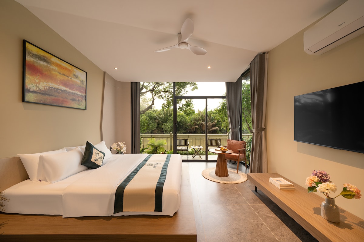 Vista al jardín: espacio tranquilo en medio de un jardín verde Garden View es una habitación doble para 2 personas, ubicada en el campus de An Tung Retreat. Cada habitación ofrece una sensación de privacidad, lujo y cercanía a la naturaleza, con una vista abierta al jardín verde, relajante y tranquilizante. Aquí, puedes disfrutar de una noche completa, con servicio completo desde un menú diverso, piscina de agua salada, hasta cómo configurar el espacio, mesa de fiesta de acuerdo a tus necesidades.