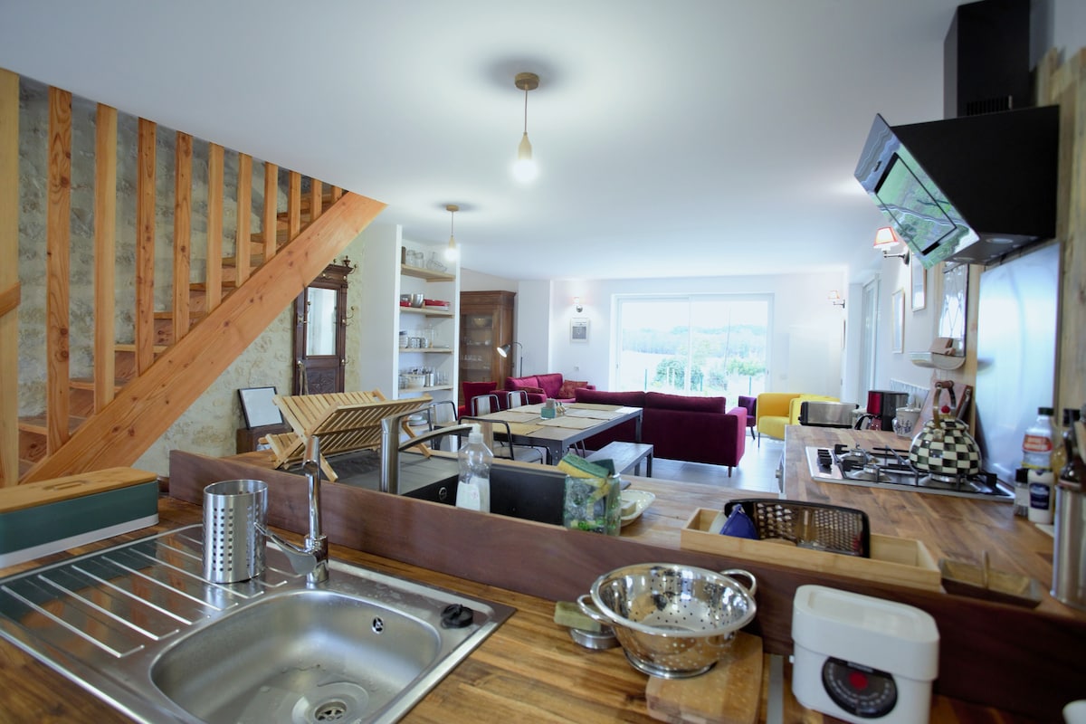 En el corazón del País de Montaigne (a 1 hora de Burdeos/Bergerac, a 20 minutos de St Emilion y de los valles de la Dordoña y de la Isla), nuestra finca ofrece un refugio tranquilo y adaptado a todos, al tiempo que le permite descubrir la región. Nuestros huéspedes disfrutan de un espacio de 20 hectáreas en nuestra explotación agrícola y de nuestro gimnasio/sala de actividades. Podemos ayudarle a establecer la continuidad de su atención médica durante su estancia. Nuestro deseo: ¡un Agroturismo Universal!