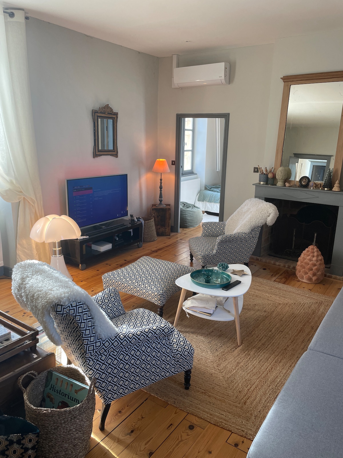 Apartamento luminoso con aire acondicionado en el 1.er piso, acceso por escalera, en el corazón del pueblo. 🛏️ No se proporciona ropa de cama Se proporcionan edredones y almohadas, pero debe traer sus fundas, fundas y sábanas para protegerlos. ⏱️ Valido las reservas en menos de 5 minutos. -40 % para estancias de un mes Una habitación con cama 2 personas Un sofá cama para 2 personas. Cama paraguas A pie: estación de tren sncf, panaderías, tiendas de comestibles, supermercados, restaurantes... Estacionamiento público gratuito en la planta baja del edificio.