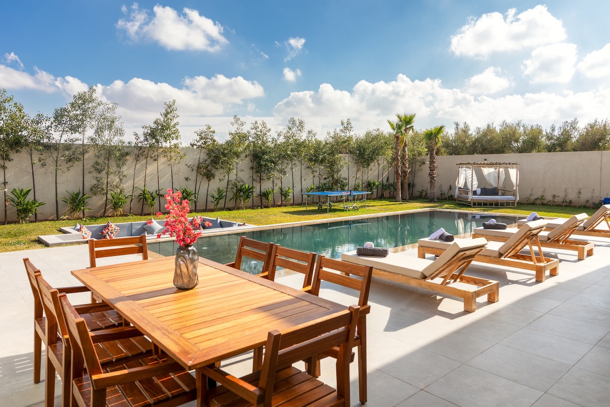 Ubicada en el corazón del prestigioso Royal Palm (km 12 Marrakech), nuestra villa privada de lujo ofrece dos suites con baño, una gran sala de invierno, una sala de verano, piscina privada y cocinas interiores y exteriores con parrilla. Disfrute del ping-pong, las bicicletas disponibles y los atentos servicios de Adil y Meryem. Una estadía exclusiva, que combina comodidad, refinamiento y tranquilidad.