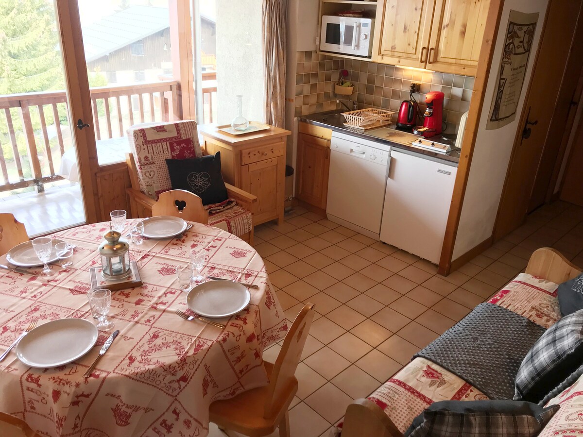 cabaña tudio todo cómodo 4 personas estación baja Les Saisies. Amplia sala de estar renovada con cocina, vitrocerámica, sofá cama, balcón orientado al sur. 2 literas en la entrada (colchones nuevos), un baño con bañera. Hermosa vista del macizo de Beaufortain. Se proporcionan sábanas y sábanas de baño. ¡Ven y disfruta de un momento de calma y relajación en la naturaleza! Acceso a varios deportes al aire libre: ciclismo de montaña o VAE, senderismo, ruta, piscina, escalada de árboles...