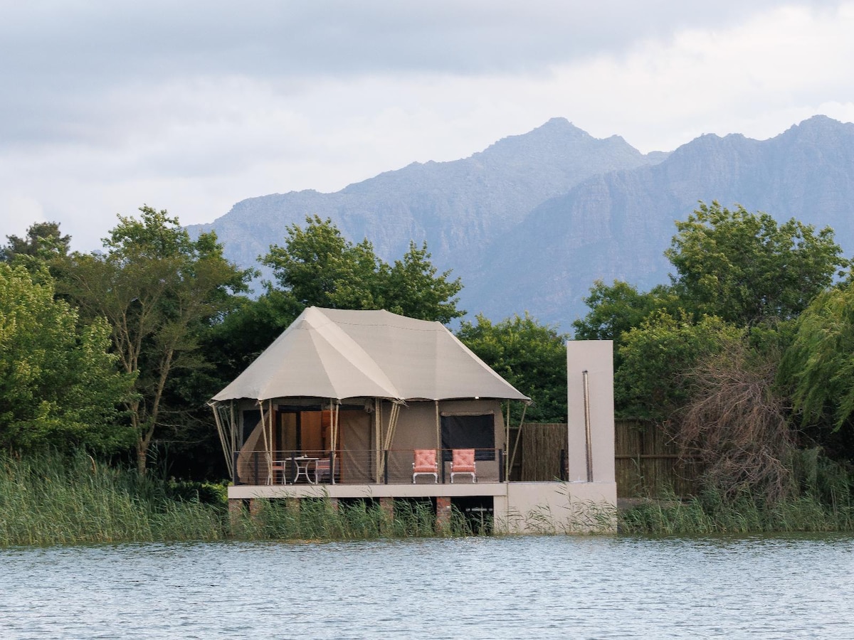 Las tiendas de campaña de glamping boutique AfriCamps están rodeadas de impresionantes montañas y viñedos. Las tiendas de campaña se abren a un prado tranquilo, donde los sonidos relajantes del río Kromme llenan el aire. Cada tienda de campaña tiene un salón, comedor, terraza de madera, dos dormitorios con camas tamaño queen, además de una litera individual en una, un baño y una bañera de hidromasaje privada de leña al aire libre.
