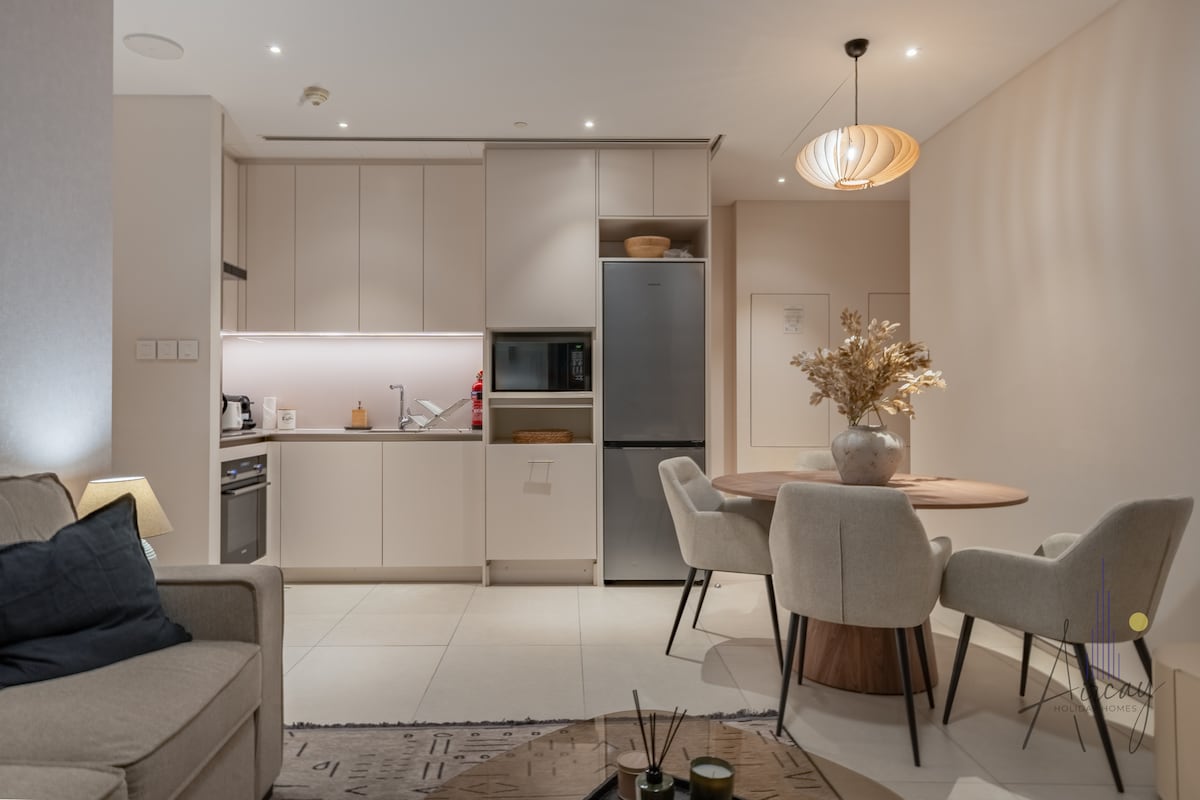 Bienvenido a tu espacio tranquilo en el paseo marítimo. Tu apartamento es luminoso, cómodo y está diseñado para estancias fáciles y relajantes. Disfruta de una acogedora sala de estar, ropa de cama suave, conexión Wi-Fi rápida, estacionamiento y acceso a la piscina y al gimnasio. Sal y estarás a pocos minutos de JBR Beach, Marina Mall, Pier 7 y el Metro, con cafés y Marina Walk justo a tu puerta. Ya sea que estés aquí para relajarte o explorar la ciudad, tu estancia es sencilla, céntrica y maravillosamente conveniente.