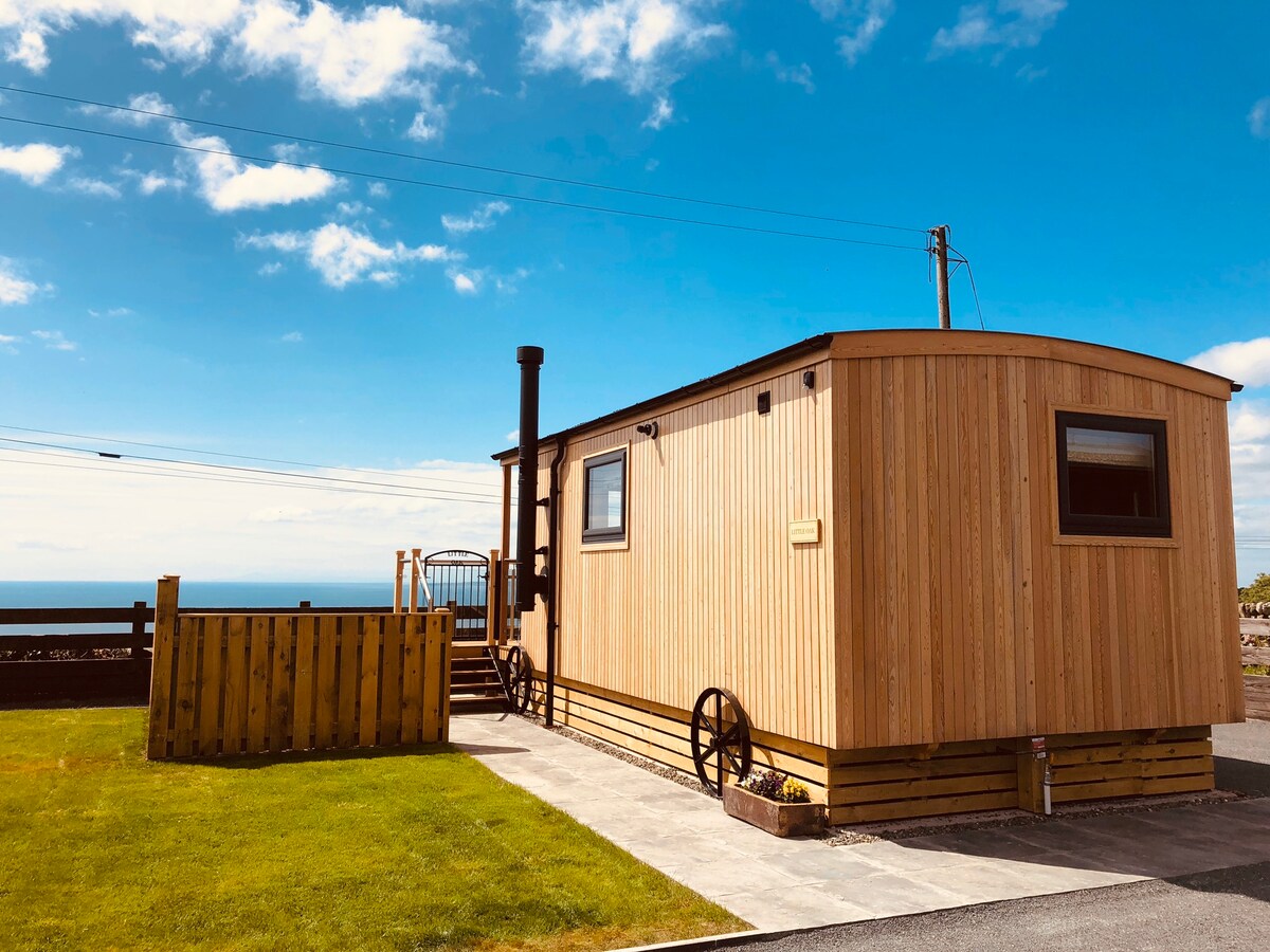 Little Beach: nuestra cabaña en el medio es un espaciosa cabaña de pastores de lujo con instalaciones completas de autoservicio con un diseño de planta abierta. Little Beach cuenta con vistas ininterrumpidas al mar sobre la Isla de Man. El dormitorio separado tiene una cama tamaño king y vistas a la colina. Con un porche cerrado con cómodos asientos en la parte delantera, puedes disfrutar de amaneceres y puestas de sol todos los días de tu estancia.