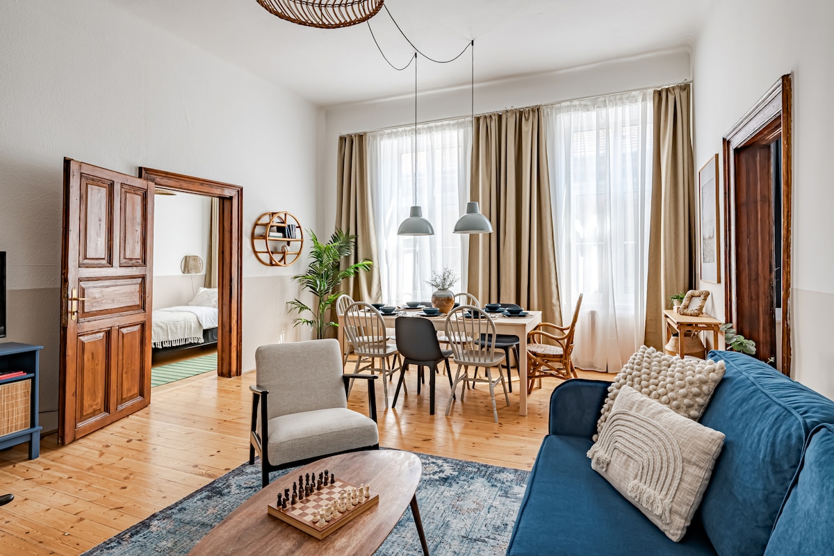 Get a glimpse into the past at this refurbished historical home. The flat features herringbone wood floors throughout, touches of color, expansive living areas, antique furnishings and decor, and multiple french balconies. The four rooms apartment is 120 m2/ 1292 Sq. Ft. It has two bathrooms one with a bathtube/shower, a sink and a toilet, the other with a shower and a sink and there is one more separated toilet too. The property is in the heart of the Palace district, home of beautiful old buildings, libraries, and art galleries. It is just a 5 minute walk from Lörinc Pap Square with its many restaurants, bars, and terraces. Within 10 minutes you will find the National Museum and the beautiful Wenckheim Palace that is home to one of largest libraries in town. The biggest food and produce market, the Great Market Hall is only 15 minutes on foot, so as the riverbank of the Danube (Fovam Square).