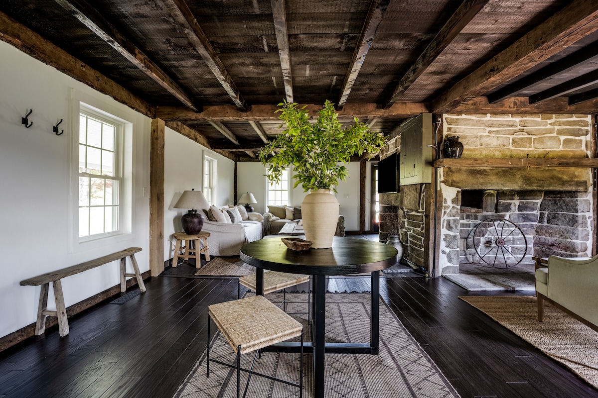 ¡Ven a alojarte con nosotros en nuestra histórica granja en funcionamiento! Relájate en la terraza trasera y disfruta de las vistas de nuestra propiedad de 12 acres y pastos tranquilos. Para una experiencia más práctica, únete a nosotros en un recorrido para ver más de cerca la vida en la granja. Fundada en 1739, nuestra granja tiene una rica historia en la agricultura y la ganadería. La acogedora casa de campo de estilo estudio cuenta con un espacio de estar abierto con dormitorio, sala de estar y comedor combinados, junto con una cocina pequeña y un baño con ducha para tu comodidad y conveniencia.