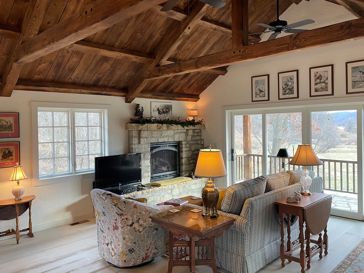 Disfruta del café por la mañana y de las puestas de sol en la terraza cubierta. Cocina tu desayuno vaquero afuera en la plancha plana y asa en la parrilla. Venga a disfrutar de las ondulantes colinas verdes de Wisconsin, el cielo azul brillante y el aire fresco y fresco del campo. Cody 's Ranch se ubica en una cresta en la hermosa región de Driftless del suroeste de Wisconsin. Experimenta la suite de vaqueros rústica con entrada privada en el nivel superior de esta cabaña con un administrador de la propiedad en el lugar.