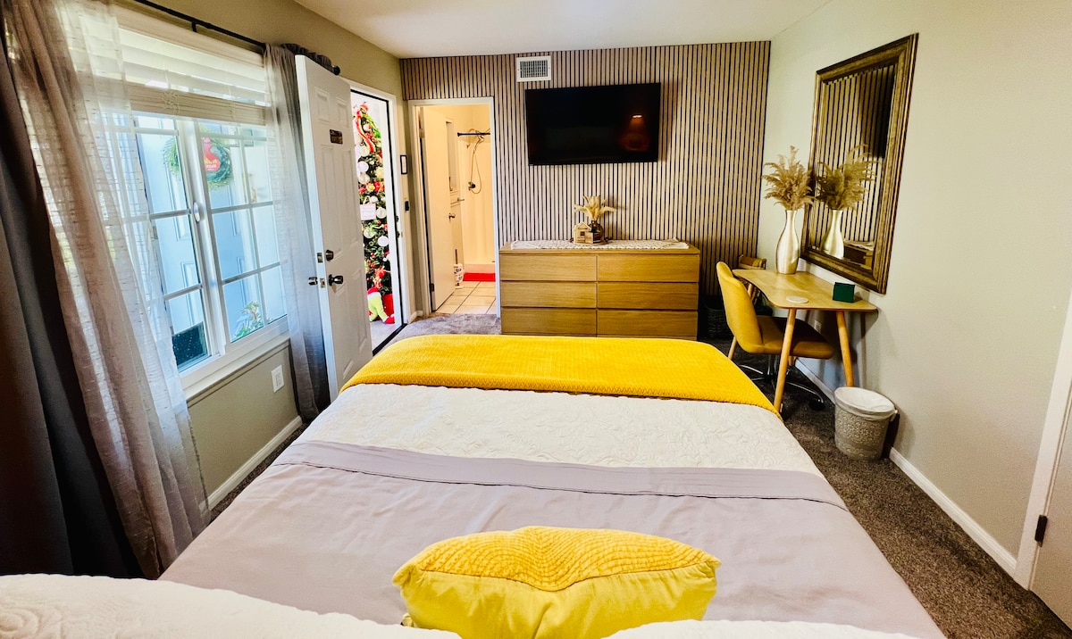 Relájate con toda la familia en una suite privada de invitados de dos dormitorios. El dormitorio tiene (1) cama tamaño king, el segundo dormitorio tiene (1) cama tamaño queen y la sala de estar tiene un sofá cama. La suite tiene (2) televisores. Se proporcionan refrigerador y microondas para tu estancia. La suite está conectada al hogar por una puerta de doble cara. La puerta permanecerá cerrada en ambos extremos. A 10 minutos en auto del aeropuerto de ont, el centro de convenciones de Ontario, el estadio Toyota y el molino de Ontario.