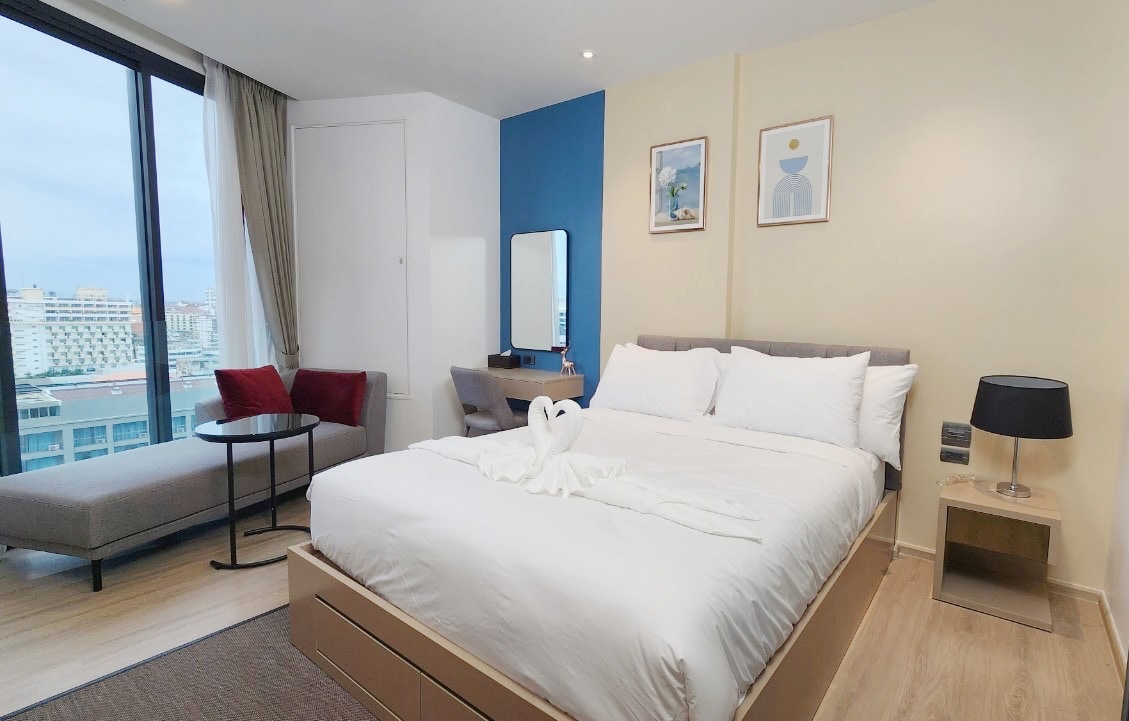 Este apartamento con vista al mar se encuentra en el corazón de Pattaya, a pocos pasos de la playa, la calle peatonal, el muelle y los centros comerciales centrales están todos a poca distancia. La piscina infinita del piso 31 ofrece vistas panorámicas de Pattaya, donde el horizonte se funde con el espectáculo dorado del atardecer. En el interior, la elegante decoración tropical combina el encanto vintage con el confort moderno, con un colchón tamaño king para un sueño premium. La base perfecta para viajeros exigentes, con café Nespresso para comenzar bien el día.