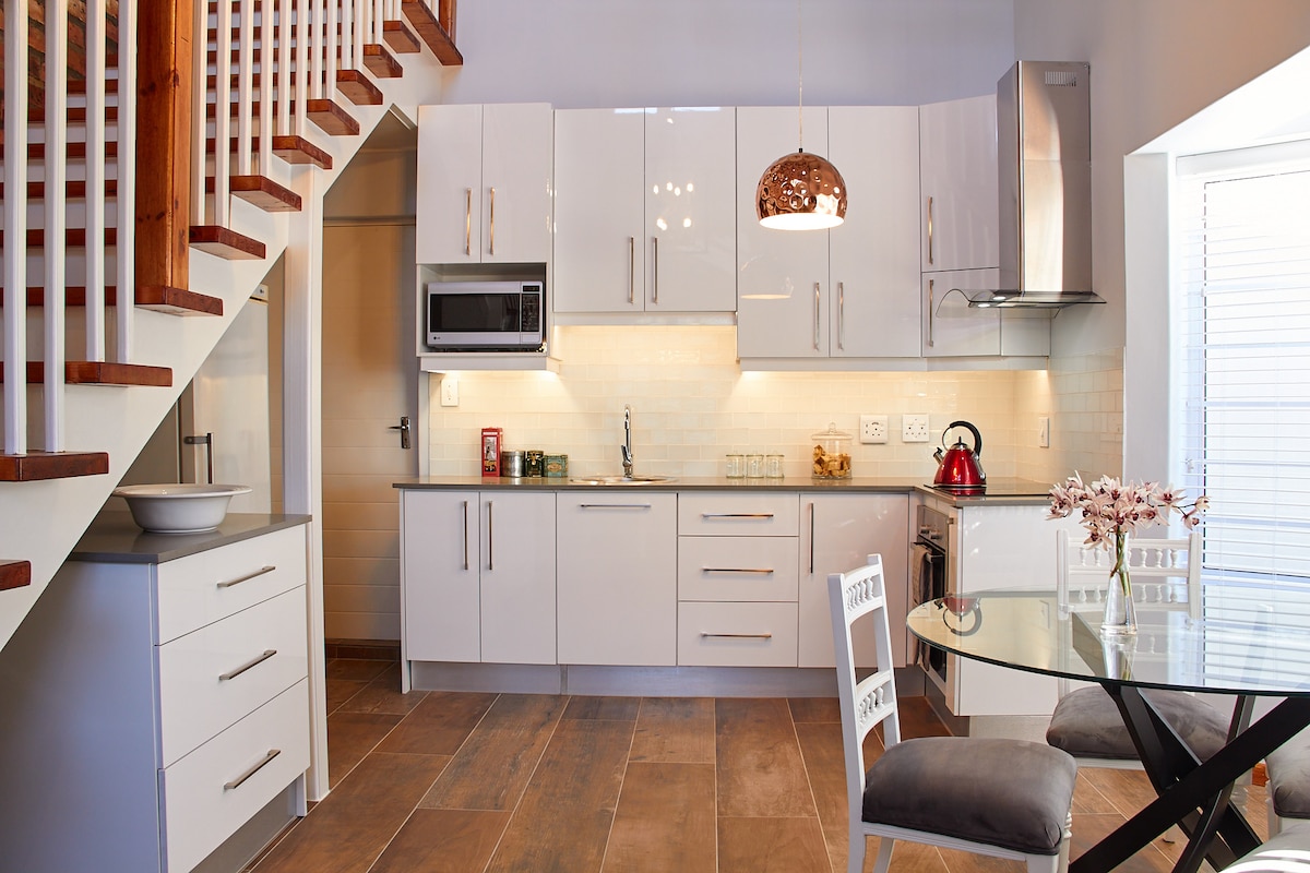 Un lujoso y espacioso apartamento de 2 dormitorios y 2 baños en 2 plantas con aire acondicionado y entrada independiente ubicado en el frondoso barrio de Edgemead de Ciudad del Cabo. El elegante alojamiento evoca un loft de la ciudad de Nueva York con techos altos abovedados. Una ubicación céntrica que se adapta a todos los itinerarios. Al sur, a 20 minutos en coche, se encuentra el centro de la ciudad, el centro de negocios y cultural, así como la costa atlántica con su gran variedad de restaurantes y minoristas. Al norte, podrás disfrutar de las famosas tierras vinícolas del Cabo en 45 minutos.