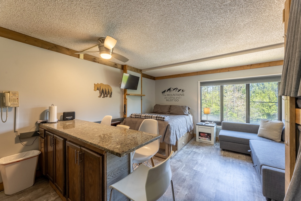 Renovated Ski In/Out Poolside/View This studio has been re-designed to maximize space. LVP flooring, granite counters, and lots of storage innovations. Queens size bed has drawers & extra stg., a Queen Sleepr & a bunk. Ideal for 2-4 adults or 2 adults & 2-4 kids. Silver Creek has day/night skiing, pool, & tubing. Your season pass is good for ALL slopes at Snowshoe, Western Territory(all black diamonds), & Silvercreek. Take the free shuttle to the Village & Western Territory (little over 2 miles)