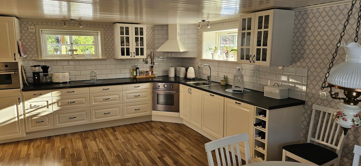 Boende där du sköter dig helt själv och kan njuta av lugnet och den fina utsikten. Bra sjösystem för SUP el båt och utmärkta vandringmöjligheter i skogarna runtom. Fullt utrustad stuga där du kan elda i kaminen inne eller tända en brasa vid grillplatsen som ligger ostört från andra grannar. För största naturupplevelsen kan ni nyttja båten som ingår. Den eldrivna motorn gör att du kan glida fram ljudlöst genom de lummiga kanalerna precis runt hörnet. 10 min från shoppingcenter
