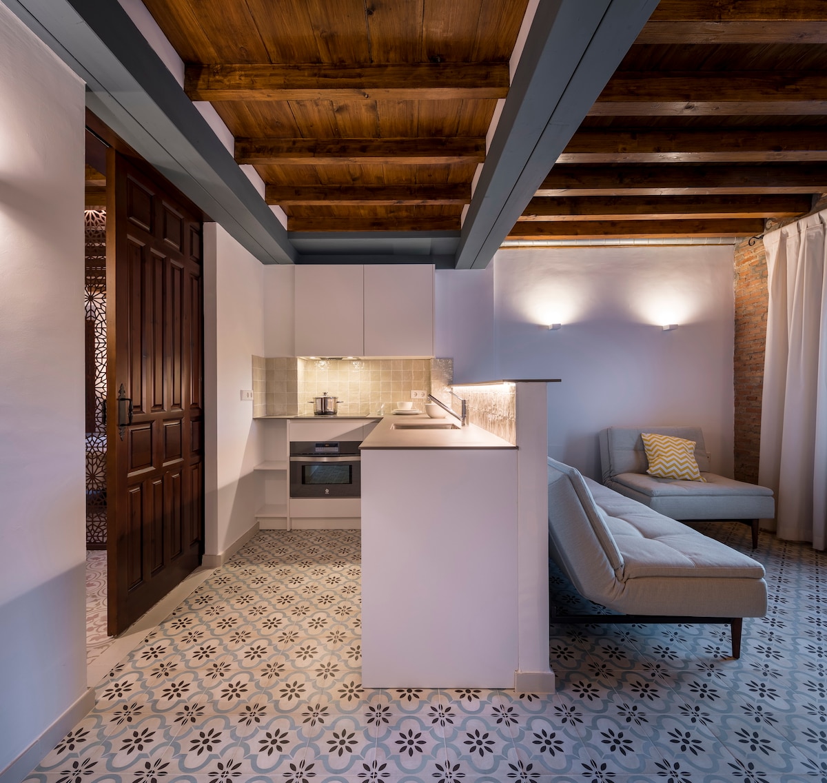 La Carrera del Darro es uno de los parajes más románticos y de mayor encanto de Granada. Este espacio, mundialmente conocido por su original vista de la Alhambra en contrapicado, ofrece una imponente y majestuosa visión del palacio nazarita que embruja a todo visitante. Justo entre uno de los puentes históricos de este paseo, El Puente Espinosa, y los restos del Puente Cadi podrás alojarte en este piso con cuidada decoración que lo hace único para una estancia inolvidable sobre el río Darro
