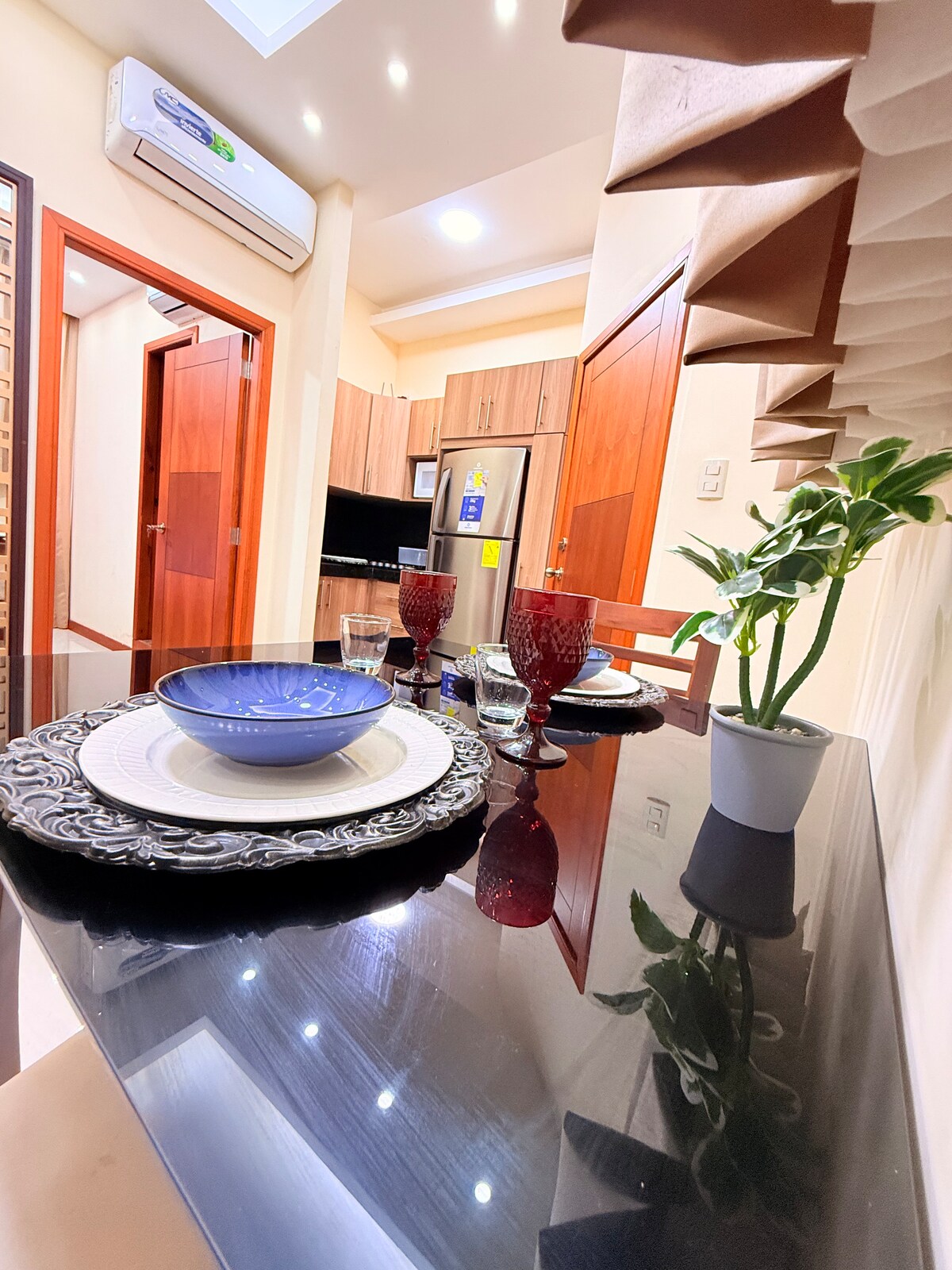 Relájate en una suite cálida y elegante pensada para parejas. Disfruta una cama amplia, iluminación suave, Smart TV gigante y una decoración en madera que crea un ambiente íntimo y relajante. La cocina está equipada para preparar algo especial, y también podrás disfrutar de la piscina y áreas exteriores tranquilas. Ubicación exclusiva en Unioro, cerca de restaurantes y zonas seguras para caminar en pareja.