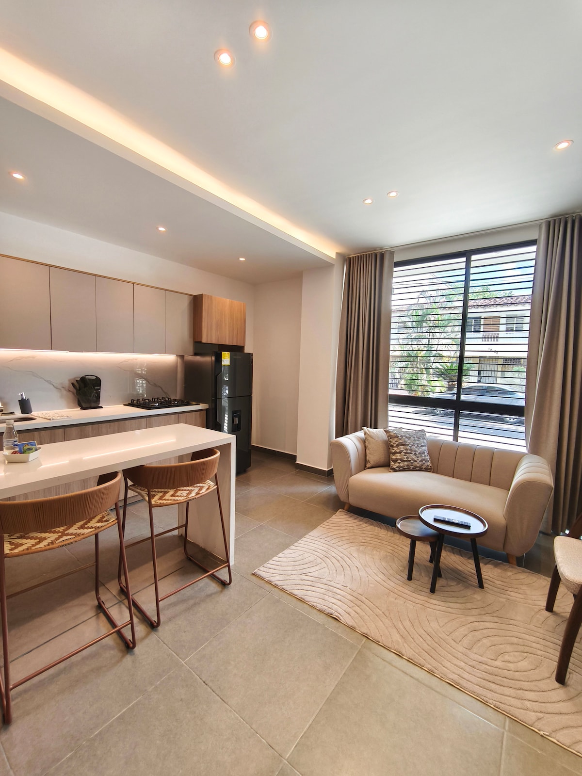 Disfruta una estancia con estilo en este apartamento moderno, diseñado para brindarte comodidad, elegancia y funcionalidad en cada detalle. El espacio cuenta con una sala moderna con Smart TV, un escritorio ergonómico ideal para trabajar o estudiar, y una decoración con toques cálidos que te harán sentir como en casa. La cocina está totalmente equipada y en la zona de lavado, contamos con lavadora-secadora. Con fácil acceso a restaurantes, centros comerciales y vías principales.