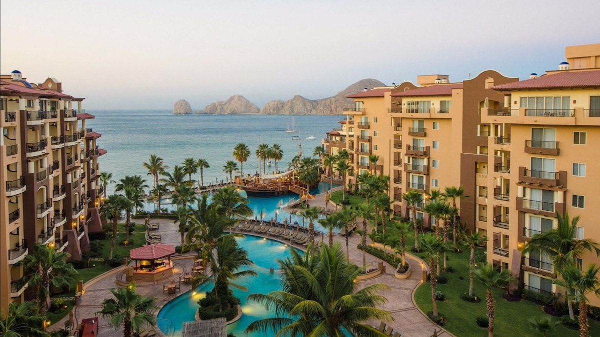 Prepárate para reservar tus lujosas vacaciones de 5 estrellas en este increíble estudio con cocina y balcón. Tiene 2 camas dobles para 3 adultos o 2 adultos, 2 niños menores de 12 años. Este es un impresionante resort de lujo frente a la playa con todos los servicios bajo el sol... ¡y sol durante todo el año! Acceso a la playa. Limpieza de habitaciones con wifi Aire acondicionado. Servicios de lavandería. Piscina gratuita Bañera. Sauna. ¡Entretenimiento en las canchas de tenis está a poca distancia a pie de la vida nocturna, Cascadas Beach Grill, Cabo Sky Tours y The Marina!