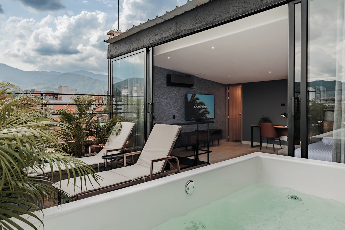 The Presidential is a luxurious 4 bedroom suite, with luxurious king-size and 1 queen beds, 6-meter private pool, sitting area, fireplace, Bosé sound system, kitchen, private bathrooms, HD smart TV, air conditioning, minibar and secure key card access. Additional services include full breakfast, daily housekeeping and access to our heated chlorine-free saltwater pool and rooftop bar, which enjoys a breathtaking 360° panoramic view of Medellín.