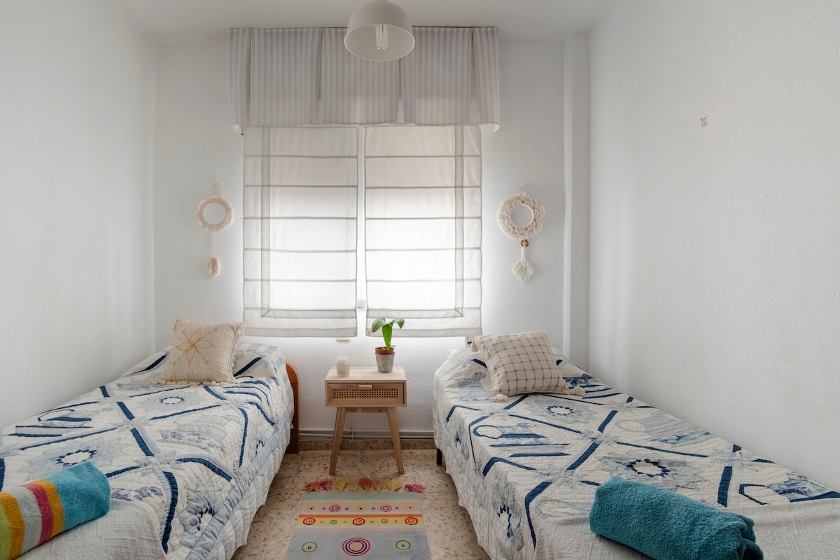 Disfruta de este precioso Adosado Dúplex con encanto a tan solo 4 minutos andando a una de las mejores playas de El Puerto. bastante luminoso y totalmente equipado. tiene dos armarios empotrados. dispone de dos dormitorios, uno con cama de matrimonio y el otro con dos camas individuales . el alojamiento tiene A/a frío y calor en salón y dormitorio principal. además de dos patios exteriores uno delantero y otro trasero.Todo para que la estancia sea de lo más agradable. WIFI 500 MG.