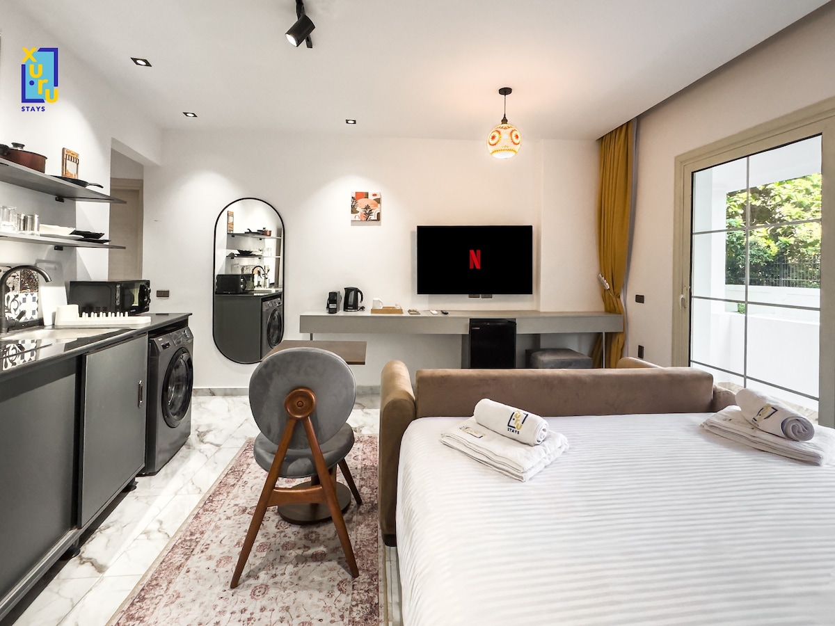 Apartamento tipo estudio en la azotea bien equipado situado en el centro de El Cairo. El apartamento está equipado con todas las comodidades necesarias para garantizar una estancia cómoda y agradable, incluida una cocina totalmente amueblada, ropa de cama cómoda e instalaciones de baño modernas. Los huéspedes podrán acceder a la azotea del edificio, que incluye una cafetería, una zona de fumadores y otros espacios compartidos. La ubicación privilegiada del apartamento a poca distancia de las principales atracciones, opciones gastronómicas y distritos comerciales.