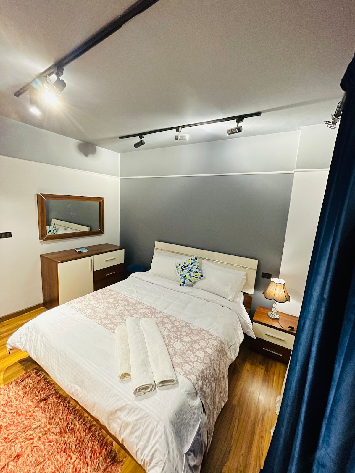 Un APARTAMENTO ENTERO con un jardín trasero situado en una zona hermosa y verde en una comunidad pacíficamente integrada que satisface todas las necesidades de los residentes. Las habitaciones están recién amuebladas, con aire acondicionado, TV inteligente y todas las comodidades que puedas necesitar, superLIMPIO y TRANQUILO. El apartamento está a 25 minutos del Aeropuerto Internacional de El Cairo. Cafeterías, restaurantes, supermercados y farmacias están cerca. Calidad de hotel con comodidad hogareña ofrecida a un PRECIO RAZONABLE.