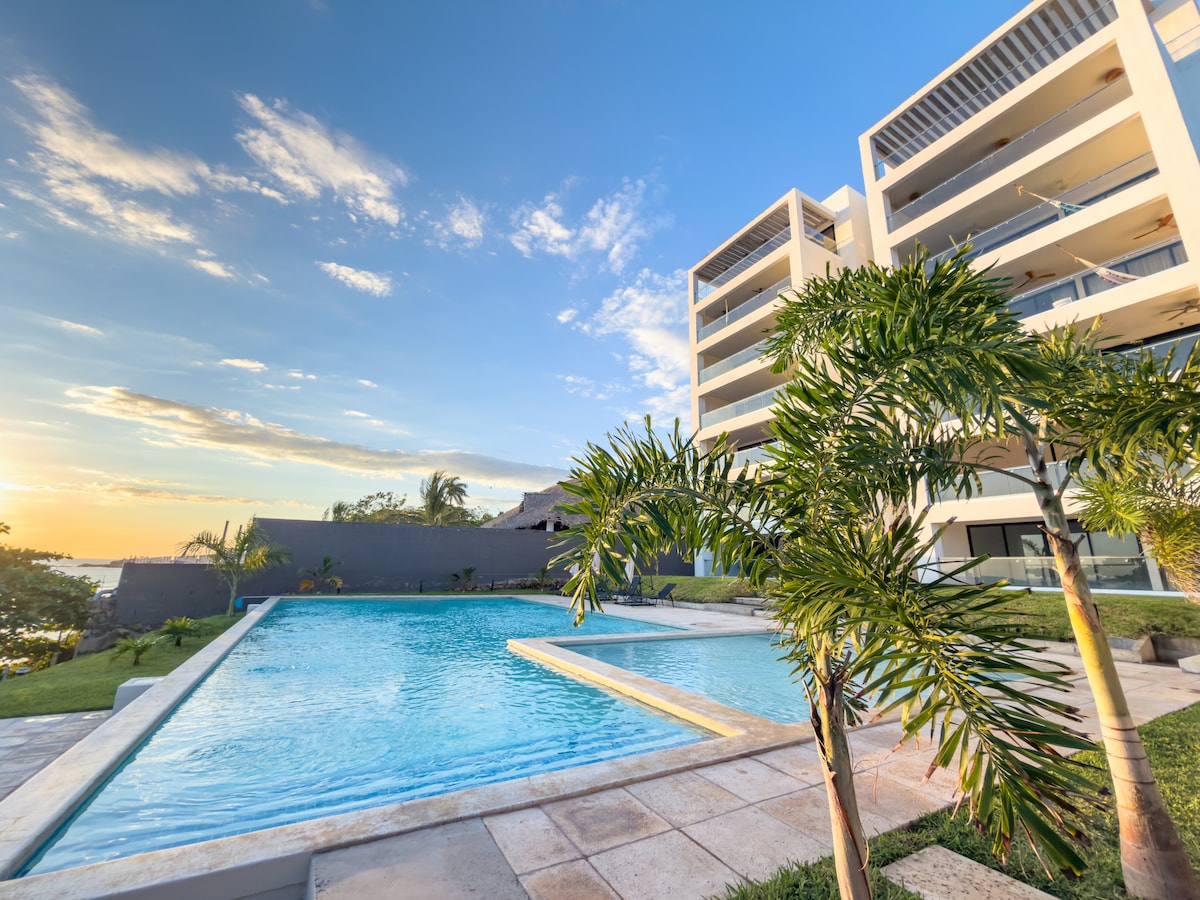 Impresionante departamento boutique frente a la playa de 3 dormitorios y 2 baños y medio en Playa Las Tunas en el quinto piso (con acceso al ascensor), ubicado en lo alto de un acantilado con impresionantes vistas al Golfo de Fonseca y a la playa. Amplia terraza con increíbles vistas al atardecer. Disfruta de una azotea comunitaria con vistas de 360° del golfo y los volcanes. Pasos a la playa privada, con una piscina infinita, estacionamiento seguro y entrada cerrada. Perfectamente ubicado para una escapada serena a la playa. Ubicado cerca de Espiritu de la montaña, varias islas y muchos restaurantes.