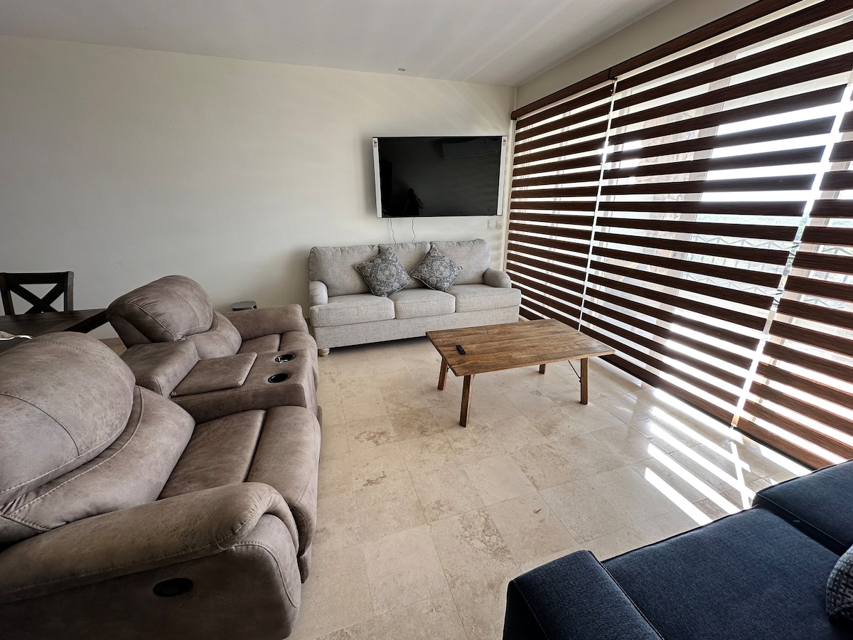 ¡Bienvenidos! Descubre la elegancia, el confort en nuestro departamento amplio y acogedor. Perfecto para familias que buscan una experiencia única. Se encuentra Ubicado en una zona exclusiva y privilegiada El Tezal. A 35 min. del aeropuerto, 10 min. en carro de Playa Médano, a 3 min. caminando de Costco, Soriana, 4 min. plaza Nova y restaurantes. En el alojamiento se pueden hospedar hasta 6 adultos y 2 niños menores de 11 años .