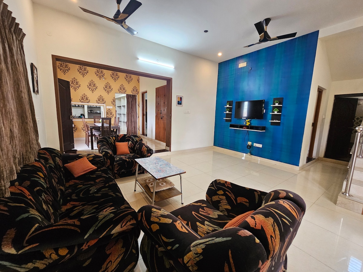 NO SE PERMITE COCINAR SOLO SE PERMITEN FAMILIAS LOS NIÑOS MENORES DE 12 AÑOS SE ALOJAN GRATIS Te damos la bienvenida a nuestra encantadora casa en un pueblo tranquilo cerca de Salem. Este espacioso refugio ofrece una experiencia tranquila en el campo, perfecta para familias y escapadas de fin de semana. Rodeado de vegetación y colinas con vistas pintorescas. Hay vacas y perros amigables presentes en nuestro hogar para jugar. En ruta a Bengaluru y a 20 minutos de la ruta de Palakkad. Mettur y Yercaud están a una hora en auto. Se puede organizar el desayuno y se cobra un cargo adicional.