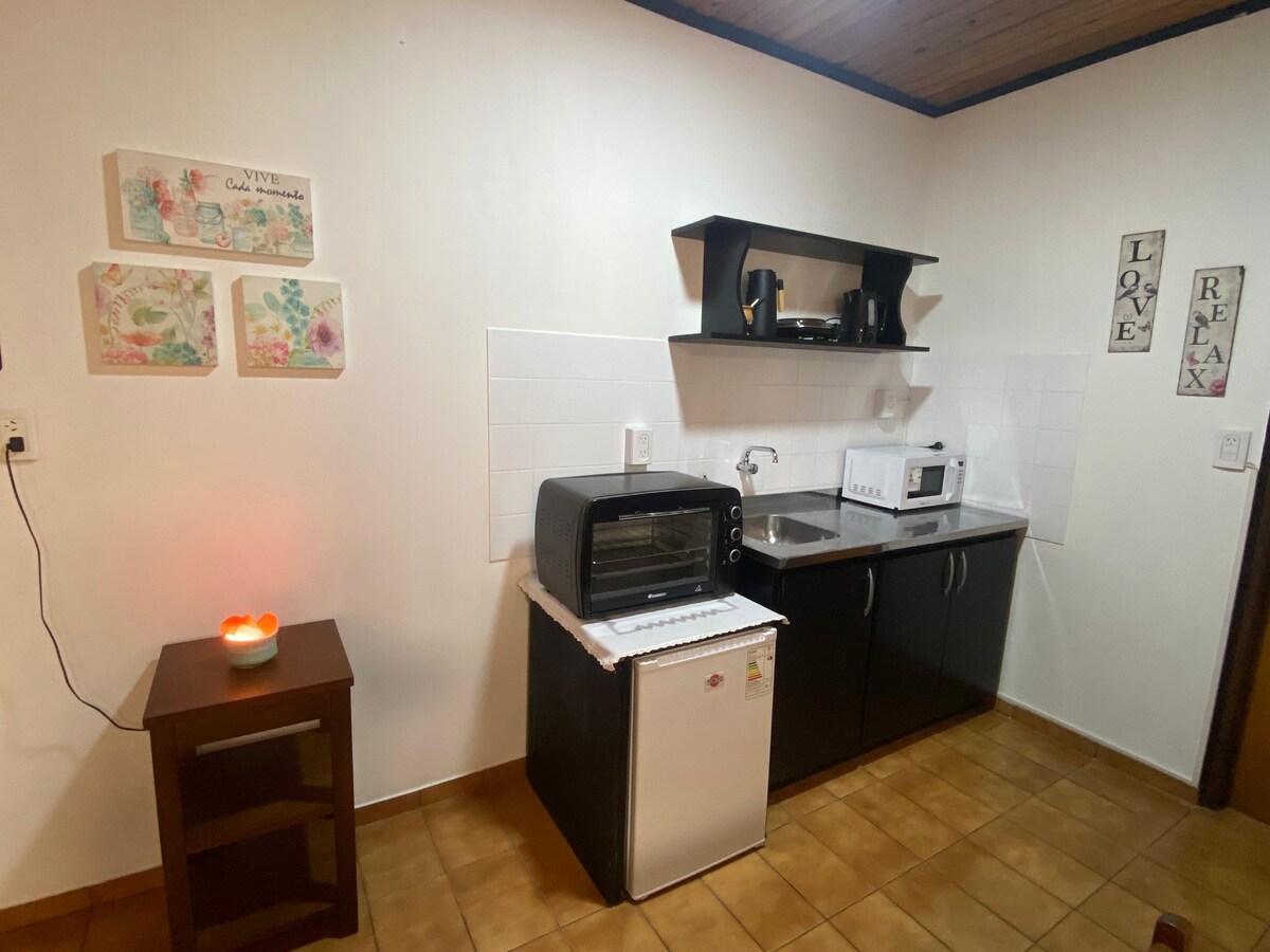 Disfrutá de la sencillez de este alojamiento tranquilo y céntrico. No puede haber mejor ubicación . Con terraza privada y parrilla, hamaca, sillas de jardin. Lavadero. Cocina completa, horno, anafe,.heladera, ollas, etc.. Vení con tu mascota, familia, pareja. Habitación amplia y con cómodo Placard. TV y sistema de Sonido. Acceso únicamente por escaleras.