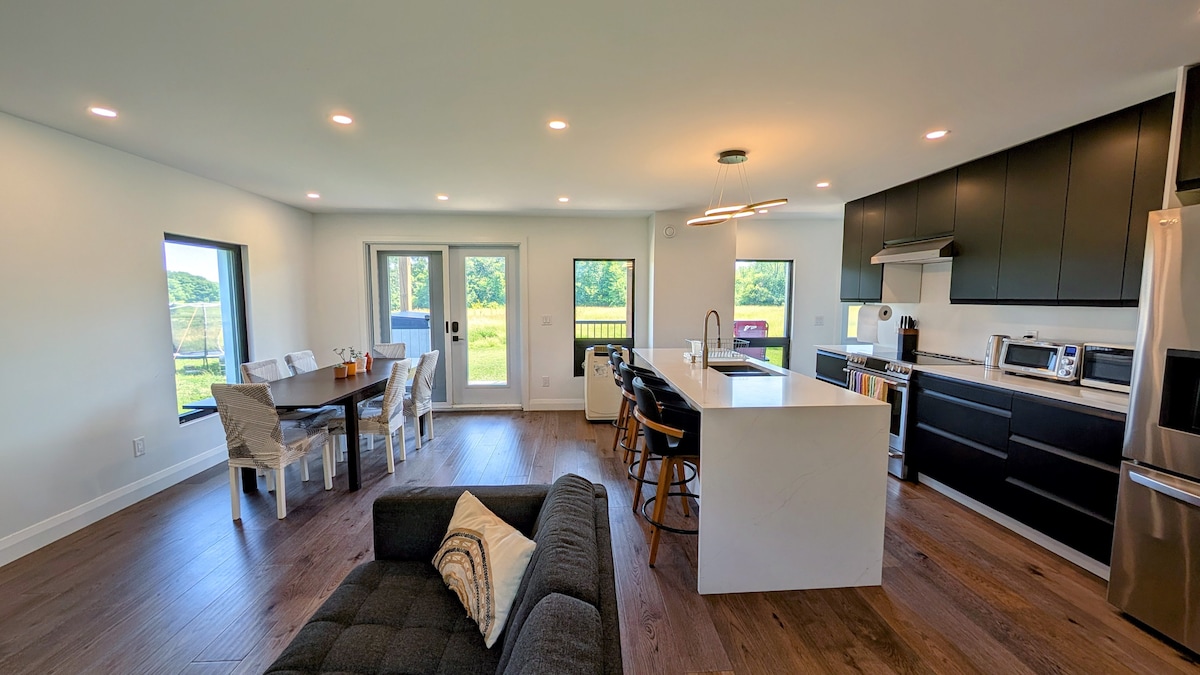 Casa de nueva construcción diseñada específicamente con la idea de los huéspedes en mente con vistas al río Saint Lawrence. Disfruta de una escapada inolvidable de otoño o de vacaciones a este oasis frente al mar. Destacando esta casa hay un gran dormitorio principal con vistas a numerosas islas salpicadas a lo largo de la amplia vista al agua. Se instalará una fogata al aire libre y un área de parrilla para la temporada de otoño. Camina por nuestro camino hasta tu propia costa privada. Alojamiento ideal para parejas, familias pequeñas o amigos que se reúnen