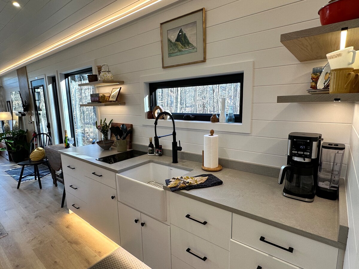 Timberwood Tiny Home es un lugar para descansar la cabeza y el corazón en Efland, Carolina del Norte. El refugio tranquilo está por un camino rural a unos 10 minutos del centro de Hillsborough. La pequeña casa de 200 pies cuadrados está en una esquina privada de 8 acres compartida con nuestra casa principal. Cuenta con detalles de estilo escandinavo, dos camas, un amplio porche, abundante luz natural, una bañera de hidromasaje de leña, sauna de barril, inmersión en frío y mucho más. Hay características de la casa que pueden hacer que no sea adecuada para niños.