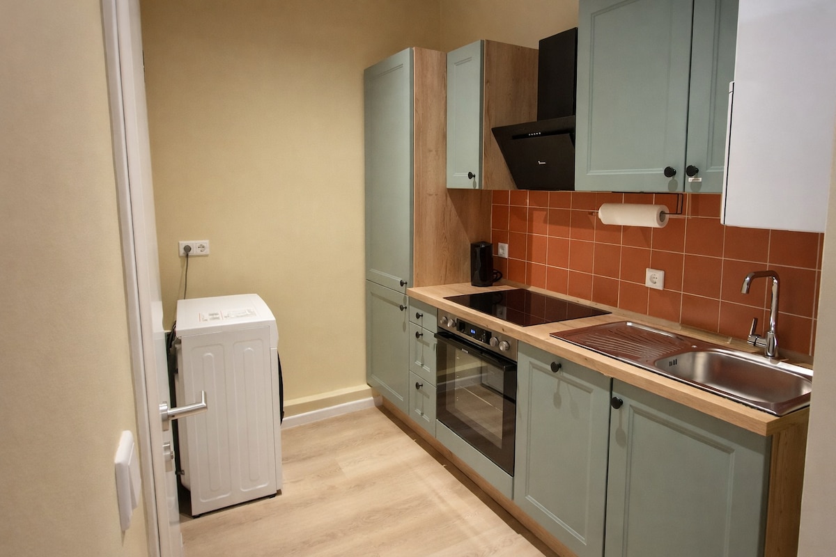 Este apartamento de 2 habitaciones recién reformado de unos 50 metros cuadrados está completamente amueblado y tiene su propia entrada. En el salón, además de la cocina de alta calidad con lavavajillas, hay una barra, una mesa con sillas y un amplio sofá (cama) con TV y un escritorio. En el dormitorio hay una cama queen size, un armario y una cómoda. El baño, decorado con buen gusto, está equipado con un inodoro y una ducha. También hay conexión Wi-Fi.