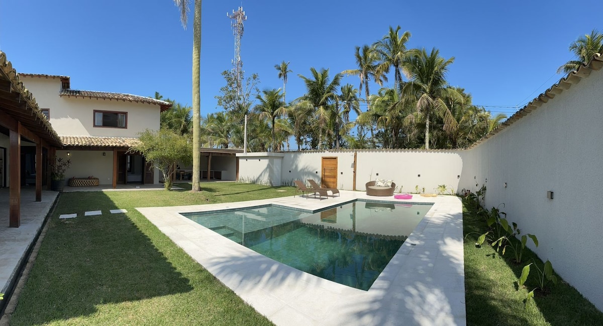 Casa a 400 metros de la playa ,piscina, zona verde con amplio césped, zona de juegos, barbacoa, horno de pizza, 6 dormitorios con 3 camas dobles y 10 camas individuales(4 con aire acondicionado), mercado Pão de Açúcar a 100 metros,calle todo en pavimento (misma calle de Condomínio Acapulco la más segura de Guarujá), 3 plazas de estacionamiento