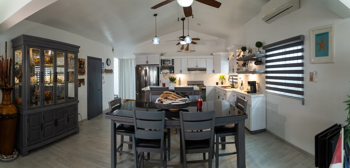 Hermosa casa amplia y acogedora, muy limpia. a solo 10 -15 minutos del centro de la ciudad y malecon de Ensenada. 2 pisos, 4 recámaras, todas son en la parte de arriba. Sala con chimenea, cocina, comedor y medio baño son en la parte de abajo. Espacio para 10 personas, Patio/jardín totalmente privado con pergola, medio baño y espacio de asador. puedes disfrutar una rica comida o cena en una hermosa cocina con todos los accesorios y utencilios necesarios para preparar los alimentos.