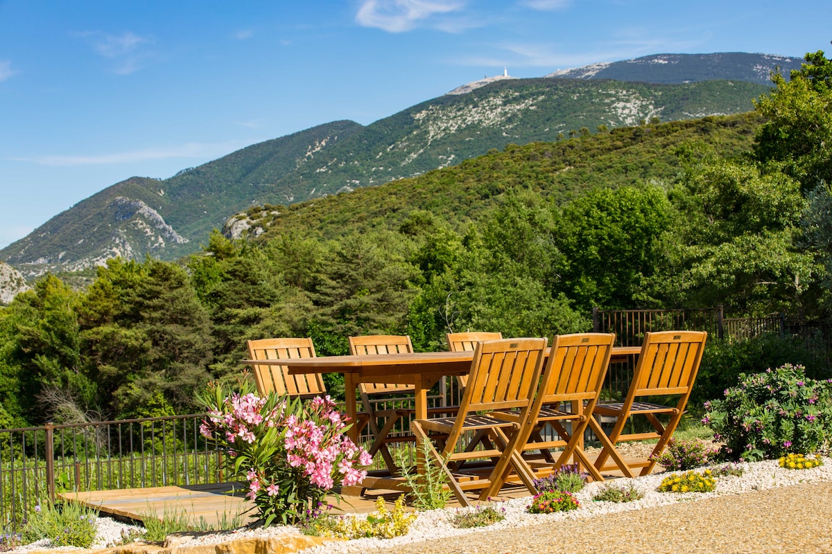 "Le Soleil du Ventoux" is a detached house (95 m2) with a large garden (1600 m2) and private heated swimming pool (open and heated from 15 of april until 15 of october). From the covered terrace you have a beautiful view of the Mont Ventoux. Moreover, you can keep an eye on the terrace while your children have fun in the pool. Do you prefer a quiet spot? Plenty of place in the shady garden under the watchful eye of the "giant of the Provence". New: charger for EV's on site. Charging included.