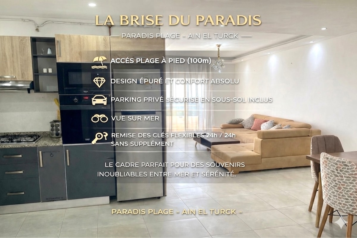 La Brise du Paradis – Vue Mer 🌊 Plage à 100m 🏖️ Évadez-vous dans ce luxueux 80 m² à Paradis Plage. Profitez d'un salon lumineux ouvert sur un balcon avec vue imprenable sur la mer. Cuisine équipée, chambre double douillette et canapé convertible ( jusqu’à 4 voyageurs ). Atouts : · Accès plage à pied (100m) • Design épuré et confort absolu • Parking privé sécurisé en sous-sol inclus • Accueil personnalisé par M. Djaafer Le cadre parfait pour des souvenirs inoubliables entre mer et sérénité.