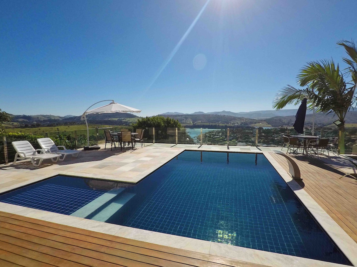 Casa luxo em Capitólio, situada no bairro Ponta do Sol, maravilhosa vista para o Lago de Furnas, Escarpas do Lago e para as montanha, sem contar com um lindo pôr do sol. São 5 suítes, duas com sacadas, total de 10 camas e acomoda até 15 pessoas, 1 sala com SmartTV, cozinha completa, piscina, deck com espreguiçadeiras, campinho de futebol, área Gourmet com churrasqueira e lavabo.
