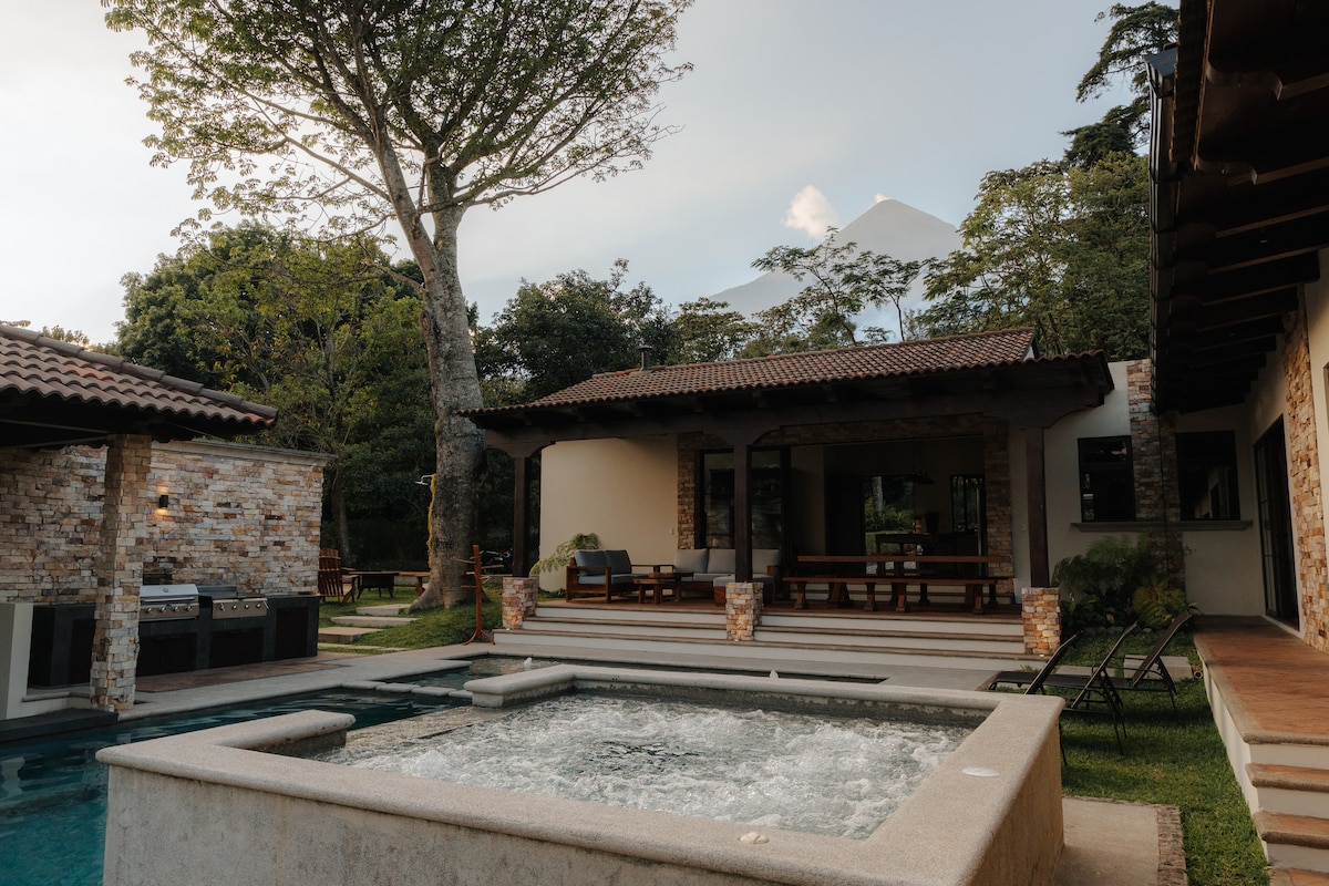 Relájate con toda la familia y amigos en nuestra casa con vista inigualable al volcán de fuego. Jacuzzi, Piscina, PoolBar, Sauna, Firepit, Minigolf, Juegos Intantiles, Librera. 6 habitaciones (1 cama Queen y 2 imperiales) Hasta 24 personas. Cuarto para empleadas. Cabaña adicional opcional, Transporte para bodas, antigua, aereopuertos adicionales.