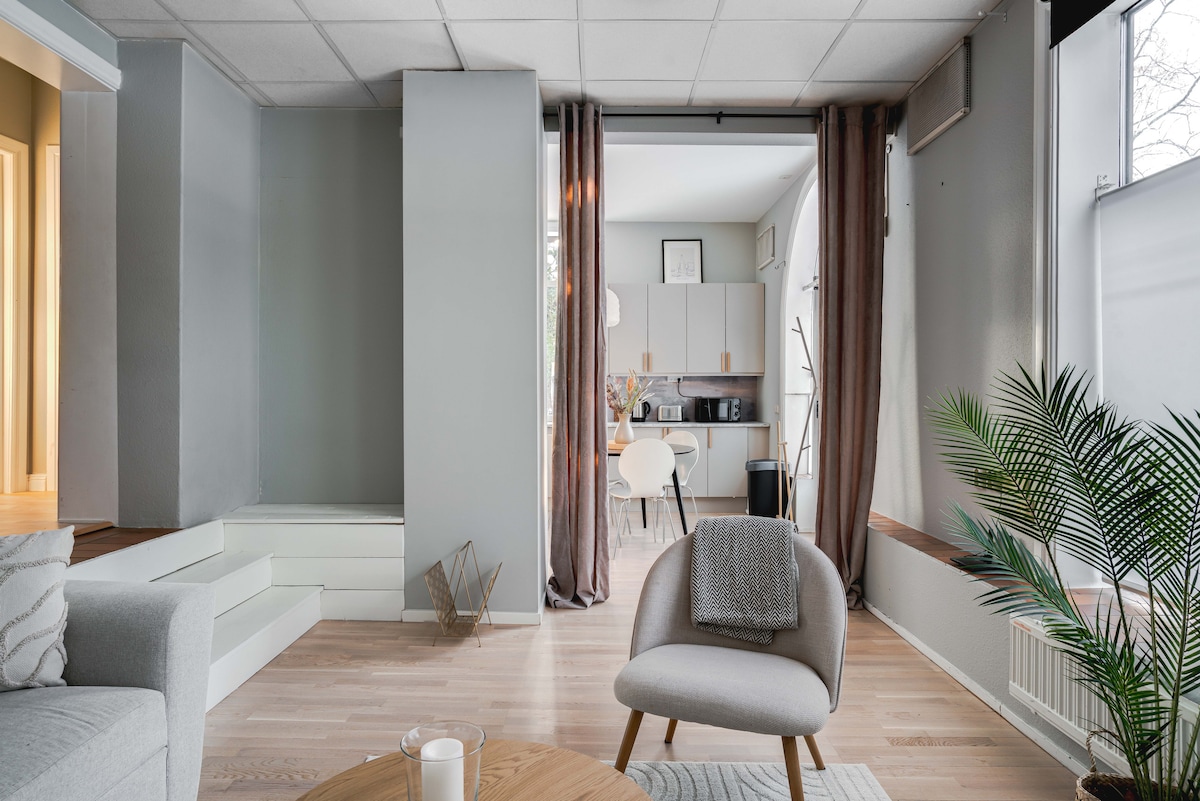 El alojamiento está situado encima de una floristería que está abierta de jueves a sábado. El alojamiento tiene un dormitorio, inodoro y ducha, cocina y sala con una planta abierta y área para dormir. Comedor y sofá en la sala de estar. TV con Chromecast. Cocina sencilla con nevera/congelador, lavavajillas, placa calefactora, horno, microondas, hervidor de agua y cafetera. Patio propio y estacionamiento en la casa. A 300 m del transporte público. Dormitorio con una cama doble de 160 cm. Área para dormir en la sala de estar tres camas de 90 cm.