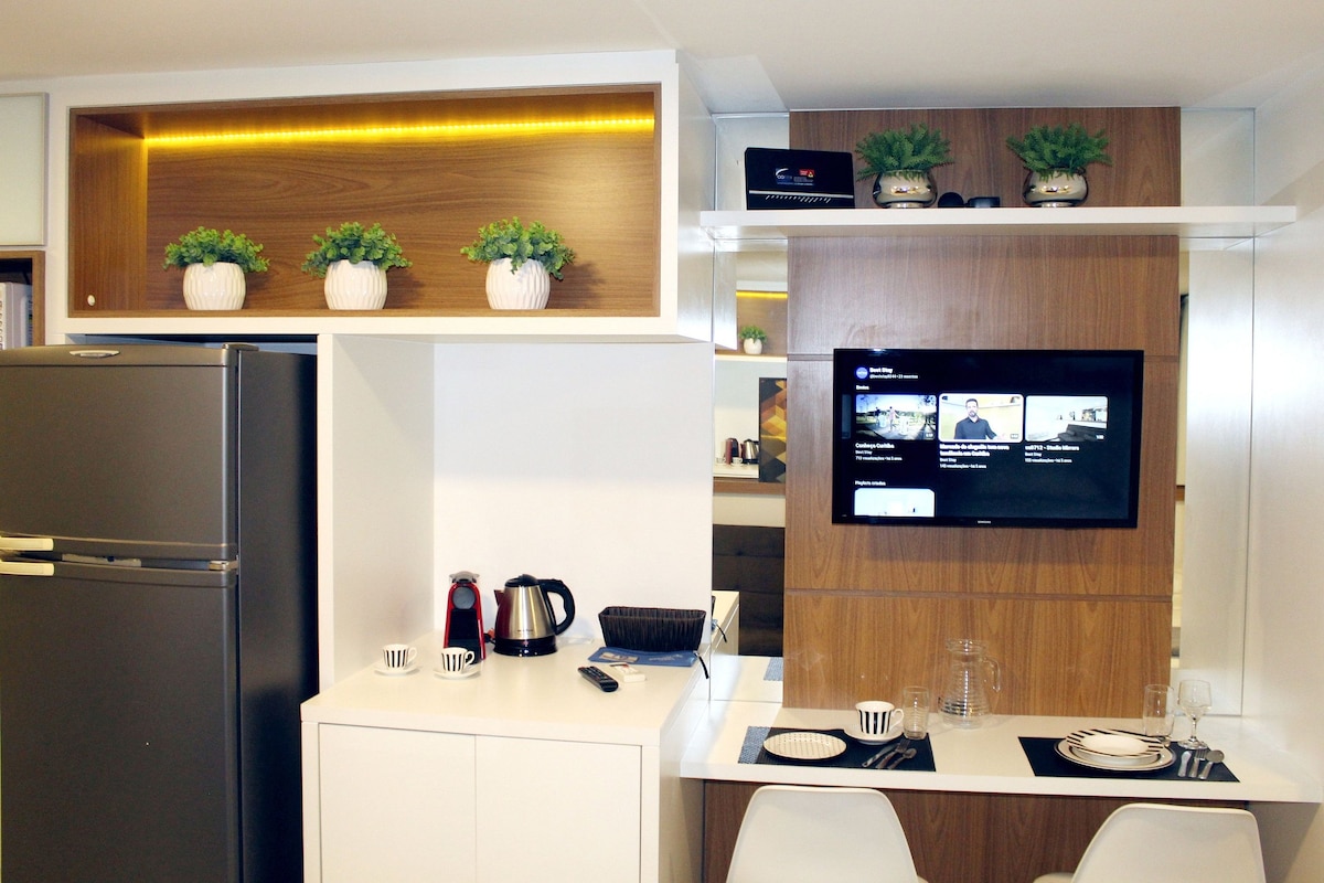 Studio de luxo completo no 29º andar, TV Smart grande, WI-FI, NET, ar condicionado, garagem coberta, piscina, academia, espaço kids, espaço para yoga/pilates, quadra de esportes, mirante, sala de sinuca, lavanderia, espaço de coworking, sala de estudo, mercearia e mercado, tudo isso dentro do edifício ao lado do Shopping Estação e de fácil acesso aos principais pontos turísticos de Curitiba. É ideal para casal, mas pode acomodar mais 2 pessoas no sofá-cama. Perfeito para aquele momento especial!