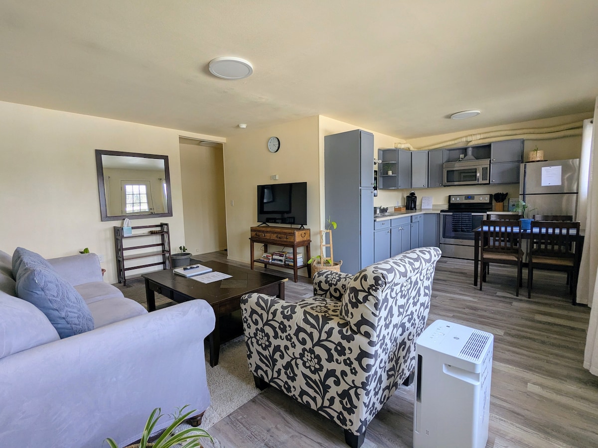 ¡Disfruta de este moderno apartamento de 2 dormitorios equipado para estancias de cualquier duración! Despiértate con café de filtro tostado en Alaska. Ve tus programas favoritos en el televisor de 55 pulgadas (se proporcionan Netflix y Disney+). Duerme bien en cómodos dormitorios con cortinas opacas. Con lavadora y secadora, puedes llevar ropa ligera y disfrutar de estancias más largas. Este espacio céntrico está a menos de 10 minutos de la mayoría de las atracciones y restaurantes. ¡Estamos deseando recibirte!