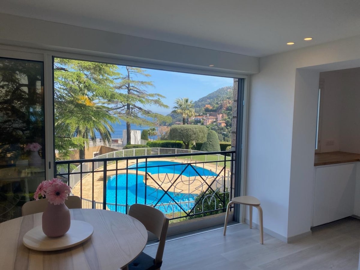 Situado en el gran Domaine du Grand Duc, asegurado con un guardia de seguridad las 24 horas en la entrada. Este apartamento se siente como una pequeña casa con su piscina privada y jardín mediterráneo, que ofrece impresionantes vistas al Mediterráneo, ¡incluso desde tu cama! Ven y disfruta de este refugio de paz y vistas extraordinarias, donde los amaneceres y atardeceres son simplemente espectaculares y diferentes todos los días; incluso puedes ver Córcega algunas mañanas.
