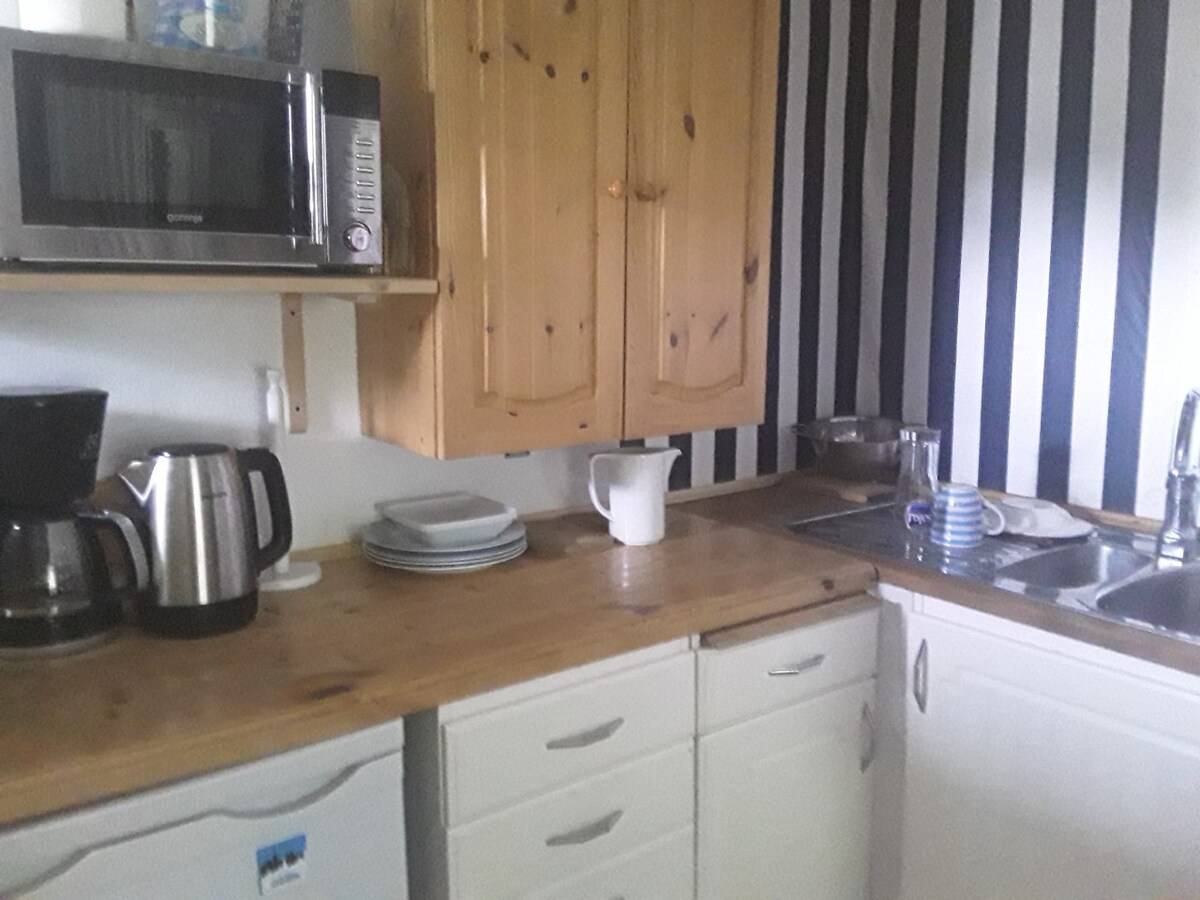 En este lugar tranquilo y elegante puedes relajarte y disfrutar del agua caliente en el jacuzzi (cargo adicional, 1 noche con reserva), relajarte en la sauna caliente (cargo adicional), asar carne y disfrutar del café de la mañana en la terraza. Ven y celebra tus grandes y pequeños eventos en compañía de tus seres queridos o sorprende a tu ser querido con una velada romántica. Para pasar el tiempo, puedes utilizar nuestra casa de parrilla con temática vikinga (tarifa adicional).