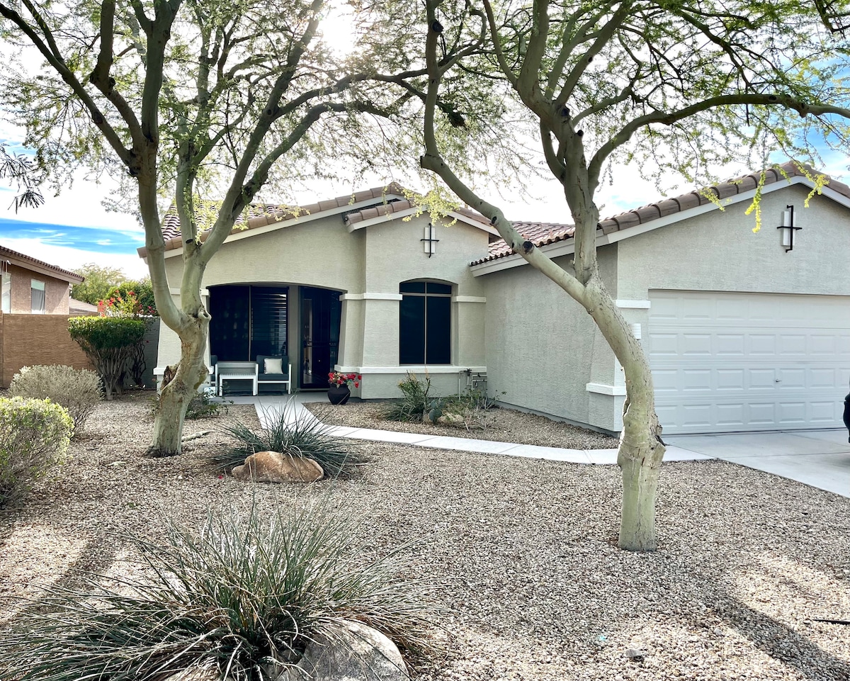 Relájate en este espacio tranquilo y elegante, ubicado en la hermosa, pintoresca y segura comunidad de Estrella Mountain Ranch (EMR). La comunidad es remota y está rodeada de montañas, senderos para caminar y andar en bicicleta. Hay casas club, gimnasios, piscinas, un campo de golf y restaurantes en la comunidad. Hay un pequeño centro comercial con supermercado Safeway y restaurantes de comida rápida. La descripción no permite el enlace real, pero puedes encontrarlo fácilmente buscando Estrella Mountain Ranch.