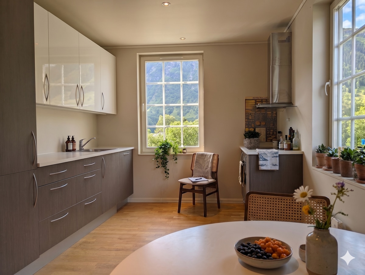 Encantador apartamento nuevo con una vista fantástica en el corazón de Rosendal. Con un amplio balcón de 16 m2, puedes disfrutar de una vista inolvidable del mar y de las montañas. El apartamento está ubicado en el centro, con acceso inmediato a todas las fantásticas attraciones que Rosendal tiene para ofrecer. El barco al restaurante IRIS está a 50 metros del apartamento det. Baroniet Rosendal, tiendas y caminatas panorámicas están cerca. Los picos de Melderskin y Malmangernuten comienzan a solo 10 minutos del departamento.