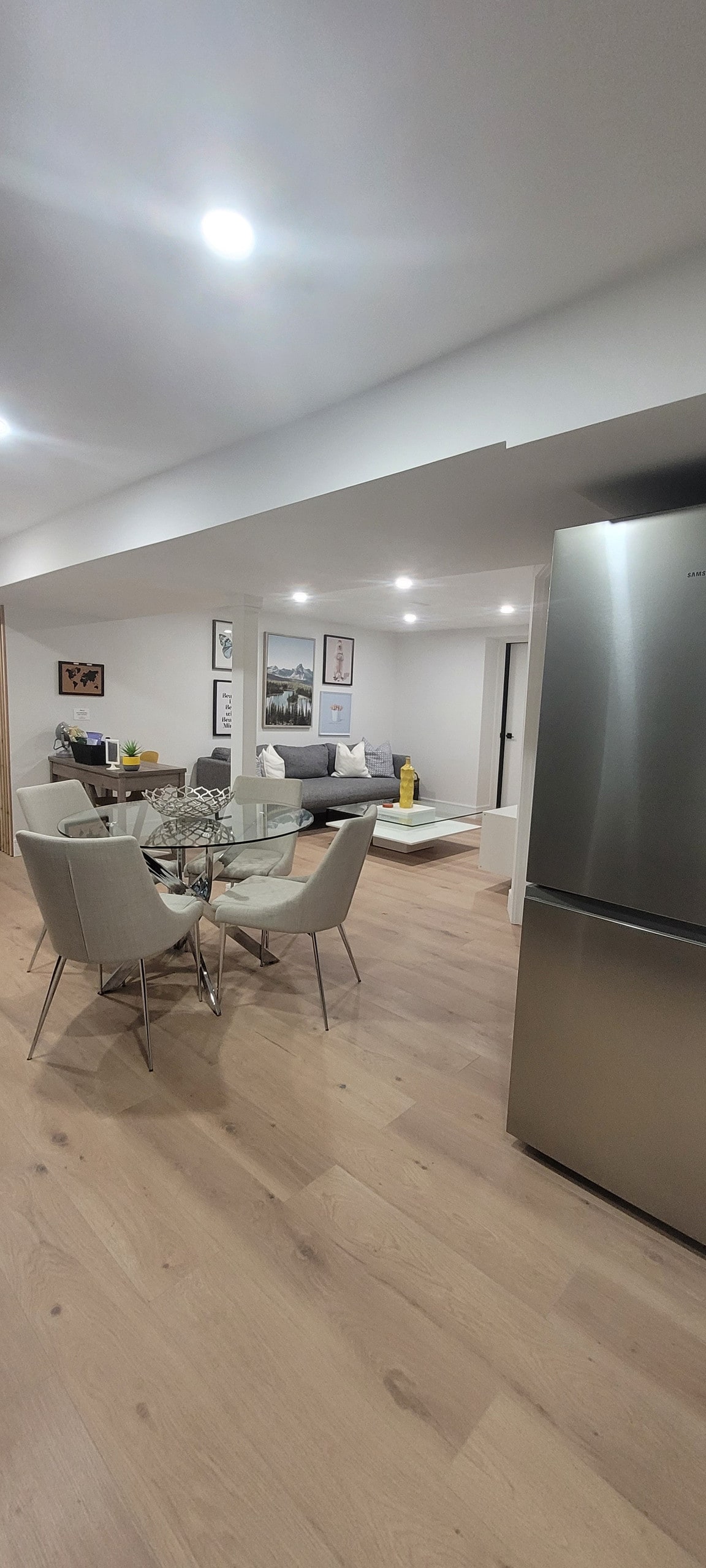 Disfruta de tu estancia en esta suite de nivel inferior totalmente renovada y moderna ubicada en el corazón de Central Etobicoke. Características: Entrada privada Dormitorio grande y luminoso con una cama tamaño queen y sábanas frescas, mucho espacio en el armario. Sala de estar luminosa con televisor inteligente, Cocina elegante y totalmente equipada con nevera, estufa, microondas, cafetera y elementos esenciales. Baño contemporáneo + tocador Lavadora y secadora en suite Estacionamiento gratuito y cargador Tesla en el lugar. Wifi de alta velocidad. Acceso al patio trasero/parrilla.